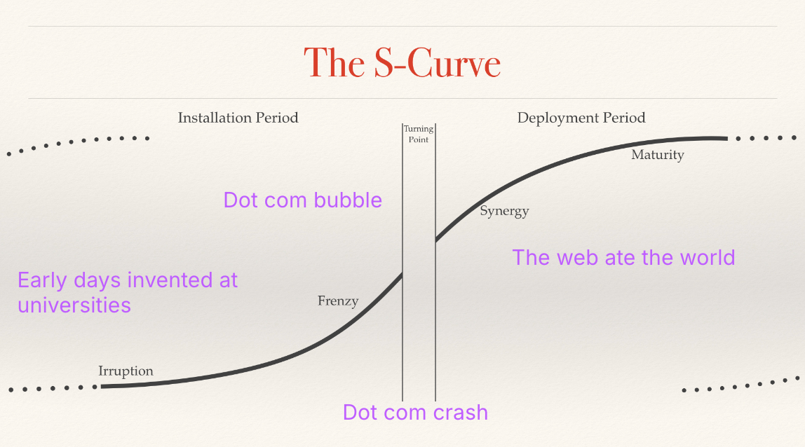 The investment and attention that came in during the bubble funds R&D and infrastructure that then is used to deploy the technology and slowly over 25 years. Over that time, the technology is deployed everywhere. And through that deployment the technology fundamentally changes the nature of the world.