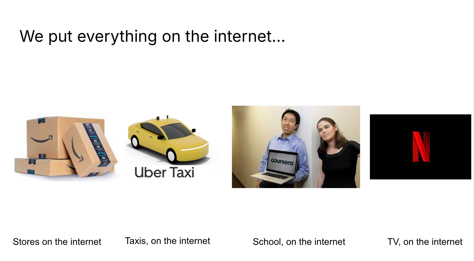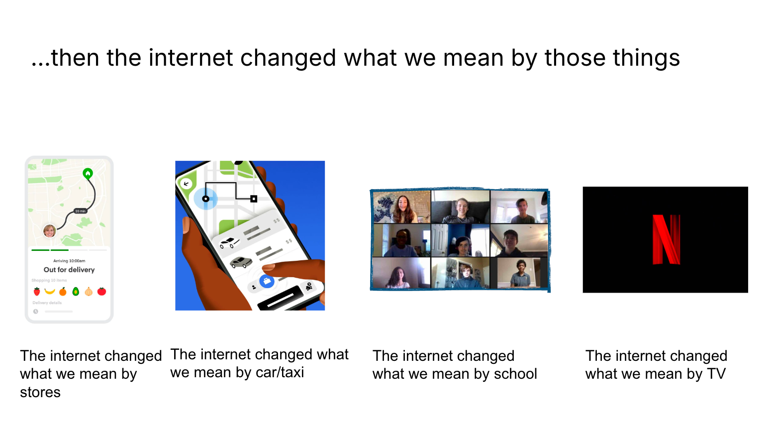 And by doing so, the web fundamentally changed what we mean by everything. (E.g. first we connected stores to the web, then the web changed what we mean by stores)