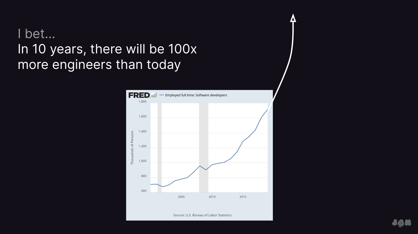 I recently gave a talk at Sourcegraph about our vision for AI at Jam.dev. I'm betting that in 10 years there will be 100x more engineers than now. This post is about why.
