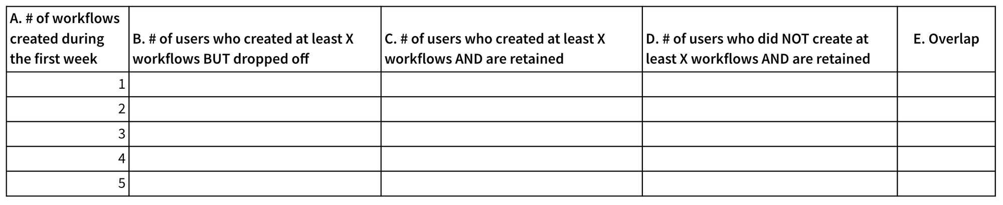 - How many of those users did not create at least 1 workflow during their first week (this is going to be all retained users who did not create even 1 workflow).