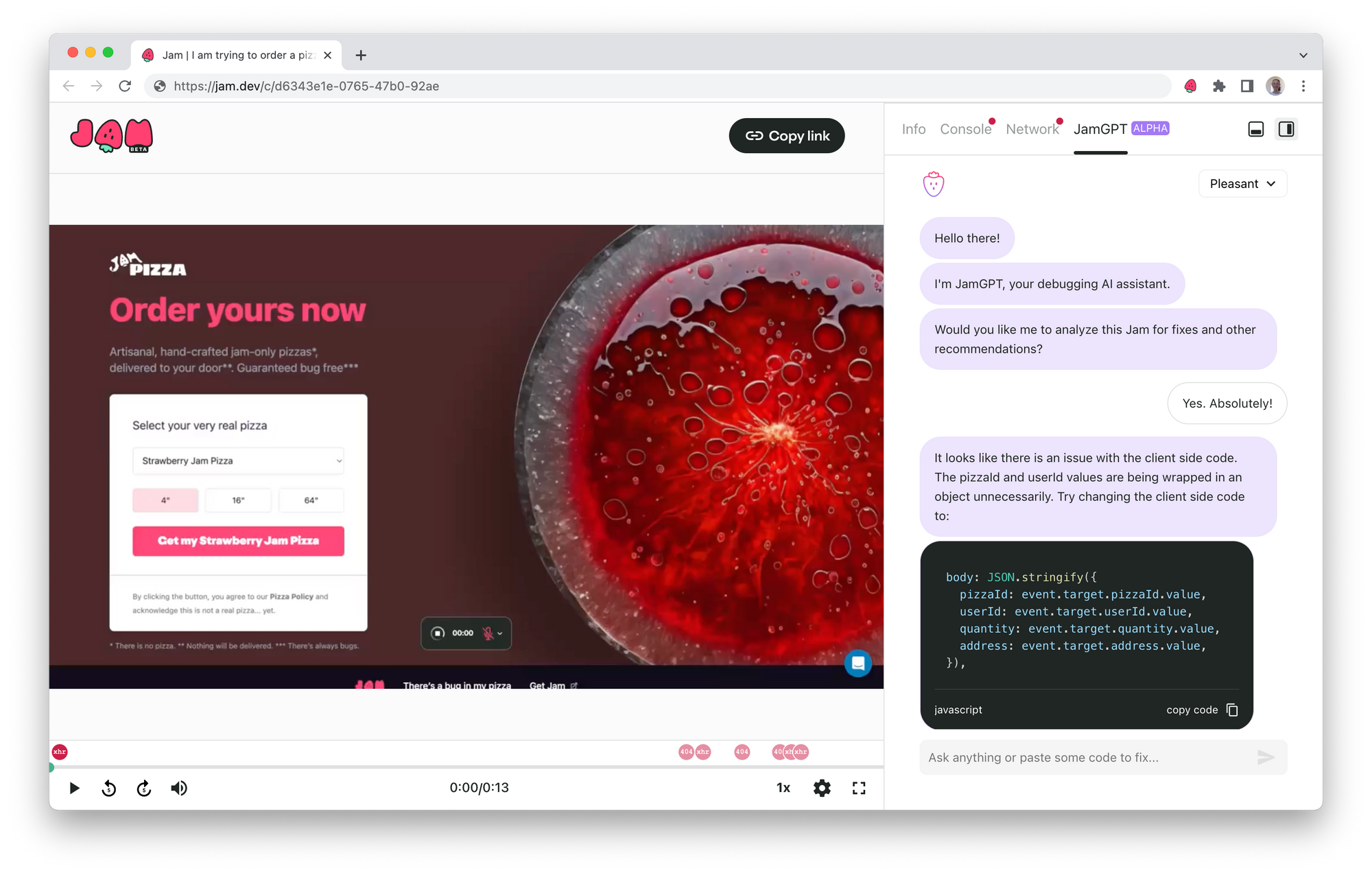 JamGPT has all the context of the browser during the bug (because it is fed with data from the Jam). And then it saves you some Google searches and suggests to you some fixes. Then you can give it the broken code and it will rewrite it with the fix.