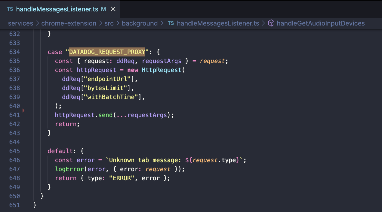 @datadog/browser-core, which is the package I patched directly, after elevating it to a top-level dependency.What we need to do now is modify this file to allow us to proxy these requests. After that, we'll be able to proxy these requests over postMessage, from our content script to our background script.